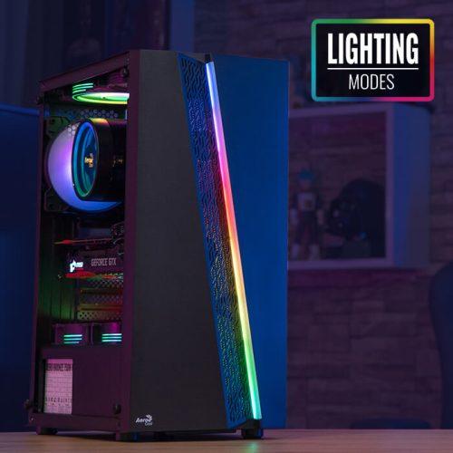 Features a stylish RGB front panel design with built-in lighting modes that can be controlled via LED control button.