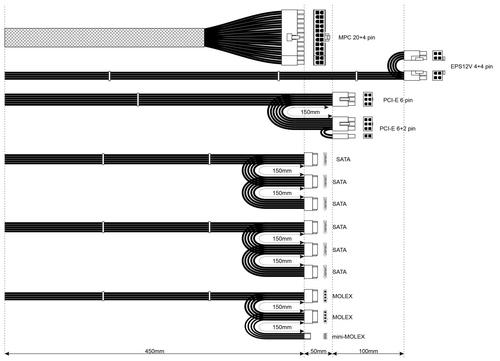 The power supply is offered with a 1.5 m power cord.Akyga AK-U4-400. Total power: 400 W, AC input voltage: 230 V, AC input frequency: 50 Hz. Motherboard power connector: 20+4 pin ATX, Cabling type: Non-Modular. Purpose: PC, Power supply unit (PSU) form factor: ATX, 80 PLUS certification: 80 PLUS Bronze. Product colour: Black, Fan diameter: 12 cm, Number of fans: 1 fan(s). Width: 140 mm, Depth: 150 mm, Height: 85 mm