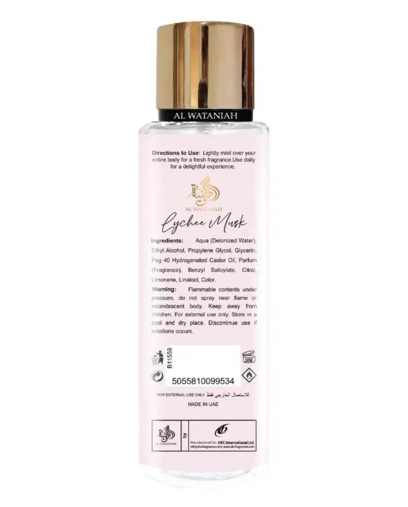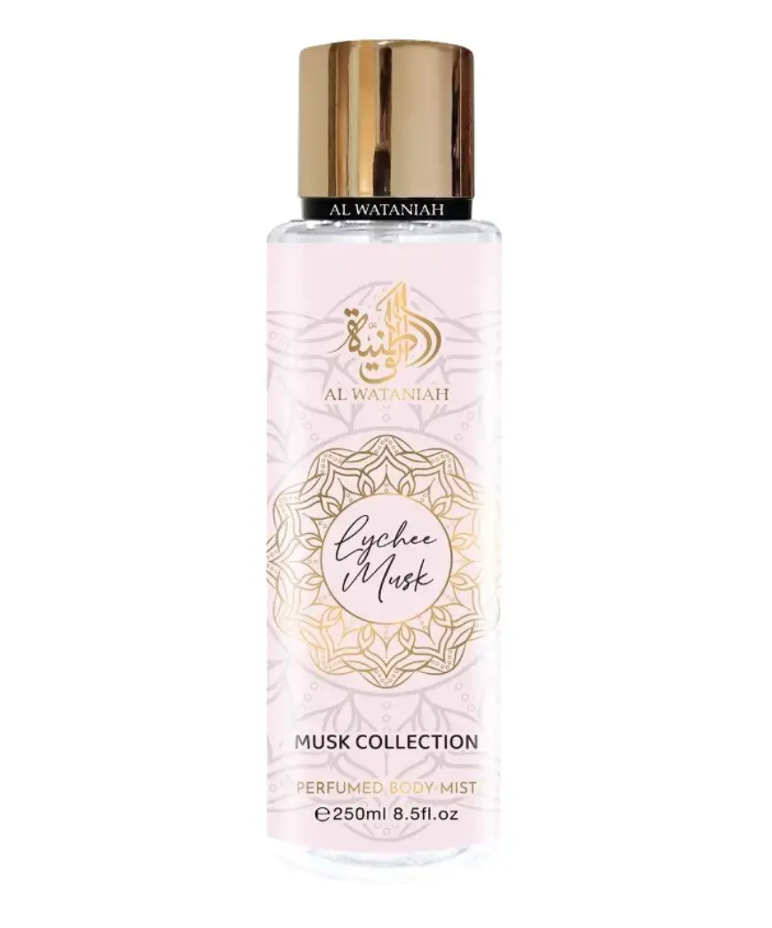 Acqua Profumata per il Corpo Al Wataniah Lychee MuskUna fragranza gioiosa, fruttata-citrica con note di fragola, limone e mandarino, arricchita da un dolce bouquet di lampone, violetta e ciliegia. La calda base di vaniglia, patchouli e ambra conferisce alla composizione un’eleganza misteriosa.Note olfattive: Note di testa: fragola, limone, arancia, mandarino Note di cuore: lampone, mora, violetta, ciliegia Note di fondo: vaniglia, patchouli, muschio, ambra Categoria: fruttato-gourmand, flore.