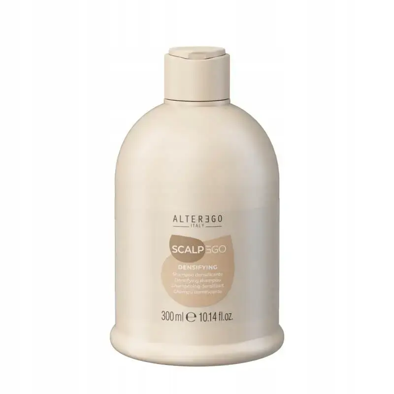 Alter Ego ScalpEgo Densifying Szampon zagęszczający włosy 300ml Twoje włosy są cienkie, delikatne? Zdarza się, że wypadają? Chcesz je wzmocnić? Przywrócić im siłę i blask i zahamować wypadanie? Zastosuj szampon Alter Ego Densifying! Alter Ego ScalpEgo Densifying to linia produktowa, która powstała w myśl pielęgnacji kruchych, osłabionych włosów, z tendencją do wypadania. . Szampon Densifying delikatnie ale skutecznie oczyszcza włosy i skórę głowy z wszelkich zanieczyszczeń, pozostawiając na długi czas uczucie lekkości i świeżości. Receptura oparta na wielu drogocennych składnikach aktywnych, które odżywiają, nawilżają, pobudzają i kondycjonują . Kosmetyk działa stymulująco na cebulki co powoduje wzrost włosów oraz zagęszczająco, poprzez pogrubienie włókien włosowych. Pielęgnacja tym preparatem zapewnia zdrowie, siłę oraz przywraca naturalny blask włosów. Zawiera: . - sfermentowany owies : oczyszcza, przywraca równowagę, działa przeciwzapalnie. - kofeinę: działa pobudzająco na mikrokrążenie skóry głowy, stymuluje cebulki do wzrostu. - keratynę: nadaje włosom objętości, pogrubia włókna, uzupełnia ubytki w strukturze włosów. - spirulinę: działa nawilżająco i przeciwzapalnie, chroni włosy przed szkodliwymi czynnikami zewnętrznymi. Właściwości: . - szampon do codziennego stosowania . - skutecznie oczyszcza włosy i skórę głowy . - nie obciąża . - przywraca skórze równowagę . - pobudza cebulki do wzrostu . - wzmacnia włosy . - pogrubia włókna . - dodaje objętości . - uzupełnia ubytki w strukturze włosów . - regeneruje i nawilża . - pozytywnie wpływa na kondycję włosów. . Sposób użycia: . Nanieś porcję szamponu na mokrą skórę głowy i włosy. Masuj skalp do chwili uzyskania piany, a następnie rozprowadź ją na długości włosów, po czym dokładnie spłucz wodą.