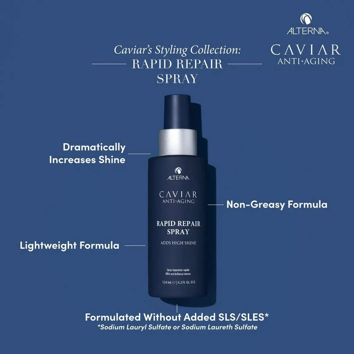 Alterna transcends ordinary haircare - with healthy, sensorial rituals and clean, skincare-inspired formulas - elevating ordinary moments into self-care experiences that instantly transforms hair and senses. Alterna products will always be formulated without parabens, SLS/SLES* sulfates, and synthetic color-we have always believed these chemicals don't belong in your hair. Whether at the salon where Alterna empowers stylists to create experiential, transformational moments or while treating at home, Alterna is an essential ritual for people who value self-care and the freedom to express themselves. Our Caviar Anti-Aging Rapid Repair Spray creates silky-feeling hair, adds buildable, high shine, tames frizz, provides humidity resistance, and nourishes strands. It's infused with our Age Control Complex and signature Flex Strength Complex. Spray over finished styles to add shine. *Formulated without Sodium Lauryl Sulfate or Sodium Laureth SulfateKey Ingredients:Infused with our signature Flex Strength Complex which is known to enrich hair with strength, moisture and prevent breakage from hair styling techniques & hot tool.