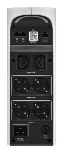 This APC Back-UPS Pro offers premium power protection for high performance gaming consoles and PC, routers/modems, and gaming accessories. The 2200VA/1320W tower UPS has 6 total outlets, 3 of which are battery back up and surge protection, and 3 that are surge protection only. It has a surge energy rating of 1080 Joules. It features Automatic Voltage Regulation to correct voltage dips and surges to proper levels. It comes with PowerChute Serial Shutdown, an easy-to-use safe system shutdown software with power and energy management features. This UPS has a 3-year warranty and a $150,000 connected equipment protection policy. It has 2 USB ports (Type A + C) for smart charging of personal devices.APC Back-UPS Pro, 2200VA/1320W, Tower, 230V, 4x Schuko and 2x IEC C13 outlets, RGB Lights, Pure Sine Wave, Arctic (White). UPS topology: Line-Interactive, Output power capacity: 2.2 kVA, Output power: 1320 W. AC outlet types: C13 coupler, AC outlets quantity: 6 AC outlet(s), Serial interface type: RJ-45. Battery technology: Sealed Lead Acid (VRLA), Battery voltage: 24 V, Battery life (max): 5 year(s). Form factor: Tower, Product colour: White, Rack capacity: 0U. Certification: IEC 62040-1-1 IEC 62040-2