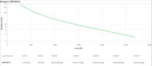 APC SRV3KI-E. UPS topology: Double-conversion (Online), Output power: 2700 W, Waveform: Sine. AC outlet types: C13 coupler, Power plug: C19 coupler. Battery technology: Sealed Lead Acid (VRLA), Battery voltage: 72 V, Battery recharge time: 4 h. Product colour: Black, Cable length: 1.5 m, Display type: LCD. Width: 190 mm, Depth: 425 mm, Height: 336 mm