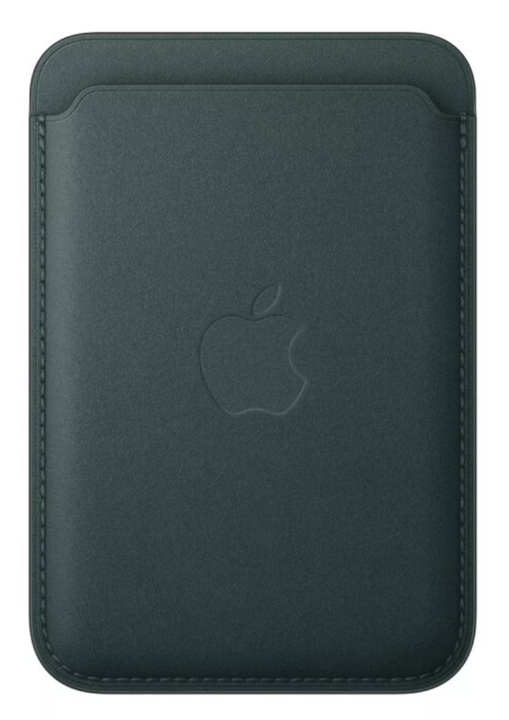 Material: FineWoven (100% recycled content) Color: Dark green Compatibility: iPhone 12 and newer models Credit card slots: Up to 3 Features: MagSafe compatibility, Find My support, magnetic