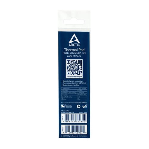 The silicon based material outperforms generic pads by far, is flexible and adaptive and thus works also at low pressure.ARCTIC TP-2 (APT2560) Performance Thermal Pad 120x20 mm, 0.5 mm. Type: Thermal pad, Product colour: Blue. Width: 120 mm, Depth: 20 mm, Height: 0.5 mm. Quantity per pack: 2 pc(s), Package width: 112 mm, Package depth: 0.5 mm
