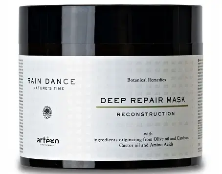 Artego Rain Dance Deep Repair Maska intensywnie regenerująca 500 ml Maska o kremowej konsystencji zapewniająca głębokie nawilżenie. . Włosy po zastosowaniu maski stają się łatwe do rozczesania, miękkie i błyszczące już po pierwszej aplikacji. . SKŁADNIKI AKTYWNE I ICH DZIAŁANIE . - Wysokie stężenie oleju rycynowego - o właściwościach łagodzących i zagęszczających. - aminokwasy - regenerujące włosy od wewnątrz. - organiczna oliwa z oliwek i oleju z karczocha hiszpańskiego . - gliceryna - o działaniu nawilżającym, odżywiającym i chroniącym przed wysoką temperaturą. - cukier - zamykający łuski włosa. - Proteiny mleczne – wydobywające blask włosów. SPOSÓB UŻYCIA: . Nałóż maskę na wilgotne włosy, rozprowadź na długości i końcach.; Wmasuj i pozostaw na 5-10 minut pod źródłem ciepła.; Spłucz.; W celu głębokiej rekonstrukcji włosów stosuj w połączeniu z fluidem termoaktywnym bez spłukiwania RAIN DANCE.; Przeznaczona do wszystkich rodzajów włosów.; Pojemność: 500 ml.