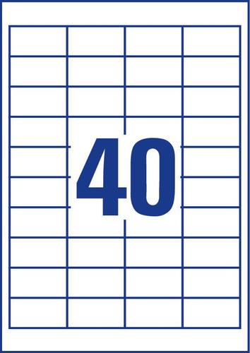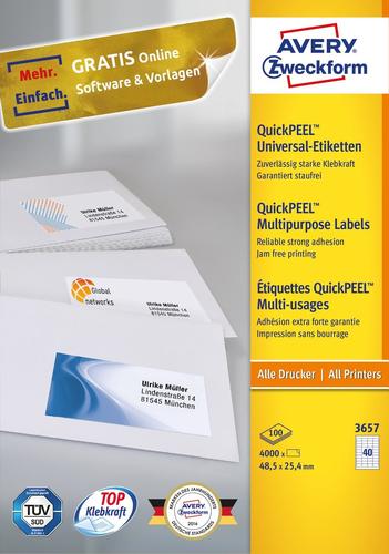 The white, permanent adhesive multipurpose labels 3657 in the format 48,5x25,4mm from AVERY ZWECKFORM are perfect for corrections/comments in documents (4000 labels/pack. You can rely on jam-free printing with no adhesive residues left in the printer. Trouble-free printing for laser printers tested and certified by TÜV SÜD. Top adhesion: the labels stick reliably strong on paper, cardboard, glass and plastic. Perfect e.g. for letters, packages, folders, binders and transparencies. The perfect label for every need with a pin-sharp image, top anchorage and no smudging. Environmentally-friendly, FSC® certified and chlorine-free bleached. Design and print your labels the quick and easy way - for the free Avery Zweckform templates and software please visit www.avery.ae/print or use the templates integrated in the Microsoft® Office packages. Extra quick handling thanks to the innovative QuickPEEL™ feature. Optimum suitability for inkjet- and colour/laser printers.Avery 3657. Product colour: White, Shape: Rectangle, Adhesive type: Permanent. Labels per pack: 4000 pc(s). Doesn't contain: Chlorine