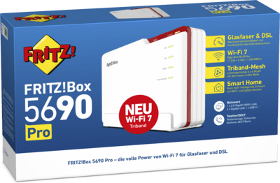 Experience the next generation of Wi-Fi with the FRITZ!Box 5690 Pro! The powerful router offers you ultra-fast Internet and interference-free connections for all your devices thanks to Wi-Fi 7.Features Fast Wi-Fi with Wi-Fi 7: Get speeds of up to 15 Gbps in the 6 GHz band and enjoy lag-free streaming, gaming and surfingVersatile connections: Connect your devices to the router via Gigabit LAN, 2.5 Gigabit WAN or USB 3.0Smart home hub: Control your DECT and Zigbee devices conveniently via the FRITZ!Box interfaceComprehensive security functions reliably protect your home network from unauthorised accessTechnical specifications Manufacturer AVM Product type Router Product colour white