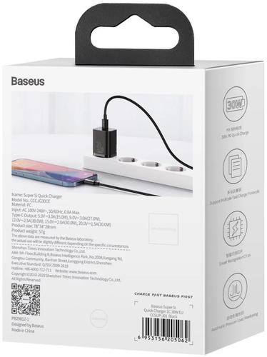 Baseus CCSUPJ01. Charger type: Indoor, Power source type: AC, Charger compatibility: Universal. Input voltage: 100 - 240 V. USB Type-C ports quantity: 1, Fast charging. Product colour: Black