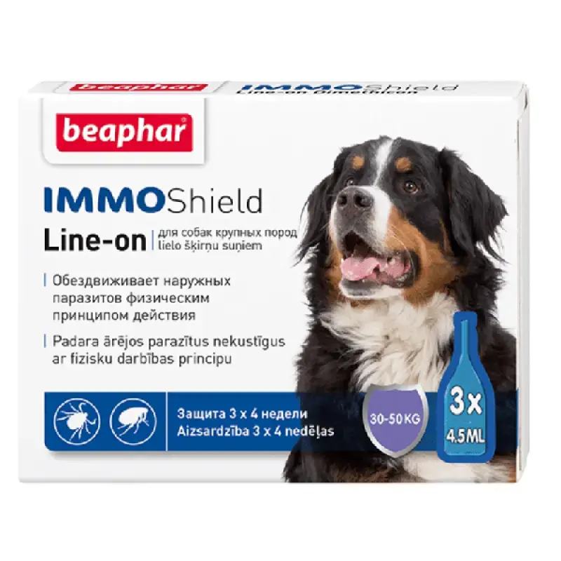Pilieni pret blusām, ērcēm suņiem - Beaphar IMMO SHIELD LINE-ON DOG Large no 30 līdz 50kg. 3 pip*4.5mlInovatīvs līdzeklis aizsardzībai pret blusām un ērcēm suņiem ar svaru no 30 kg.Komplektā 3 pipetes.