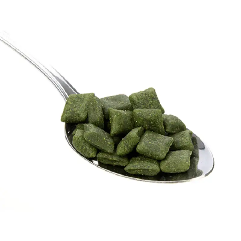 Sastāvs: graudaugi, hlorofils, minerāli, gaļa un dzīvnieku izcelsmes blakusprodukti, tauki, dārzeņi un augu produkti.Analītiskais sastāvs: olbaltumvielas 29 %, tauki 8,7 %, šķiedrvielas 2,6 %, pelni 5,4 %, mitrums 8,9 %, kalcijs 0,3 %, kālijs 0,4 %, magnijs 0,12 %, nātrijs 0,1 %, fosfors 0,75 %, α-linolēnskābe 0,044 %.Piedevas: vitamīni A 4480 ME, B1 4 mg, hlorofils 1200 mg, antioksidanti. Ražotājs: Beaphar, Nīderlande