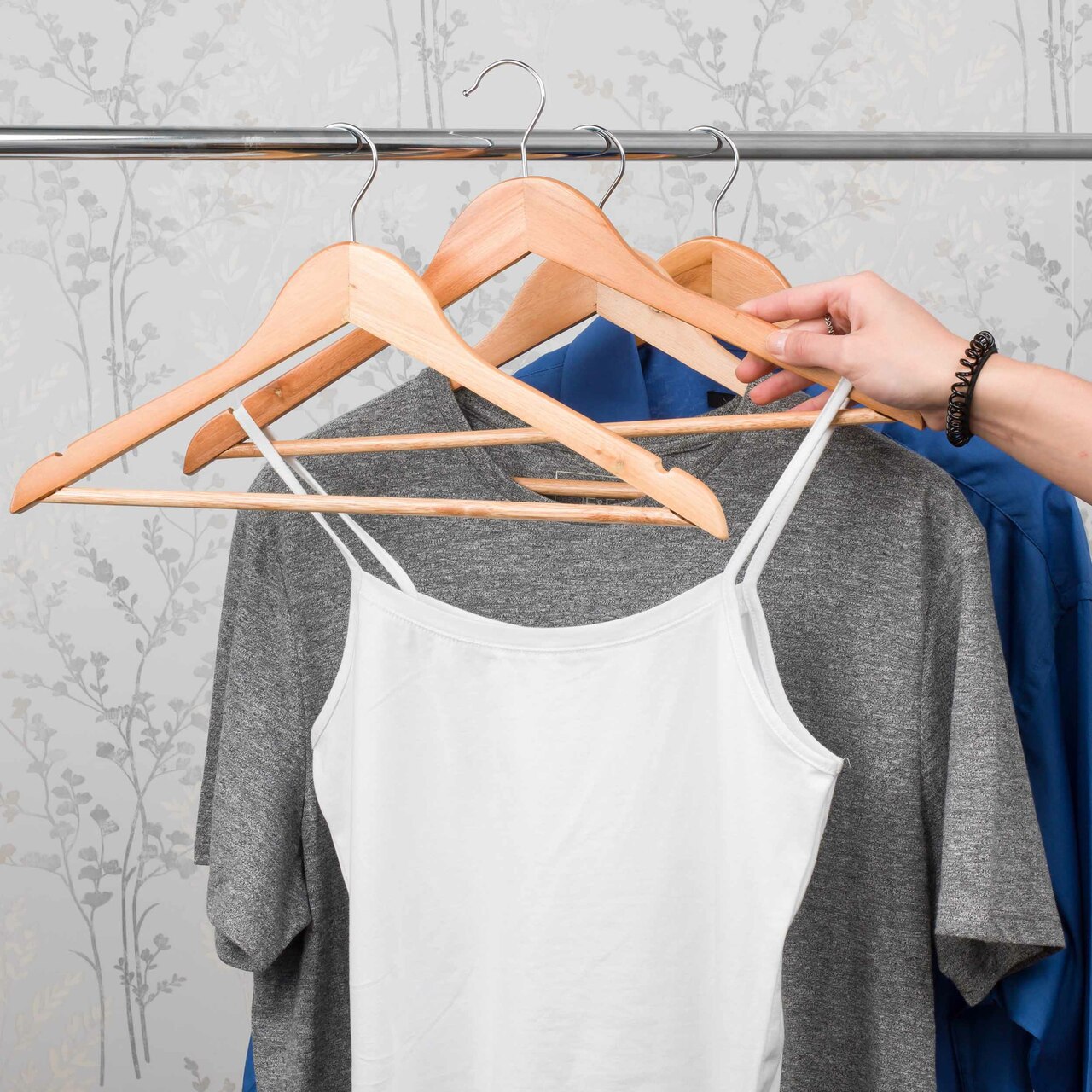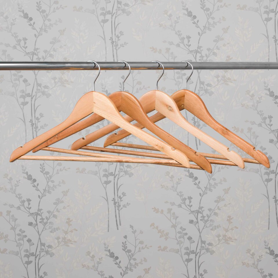 With a sleek natural wood colour, the pack of four hangers will look great displayed on rails and inside wardrobes throughout the home.