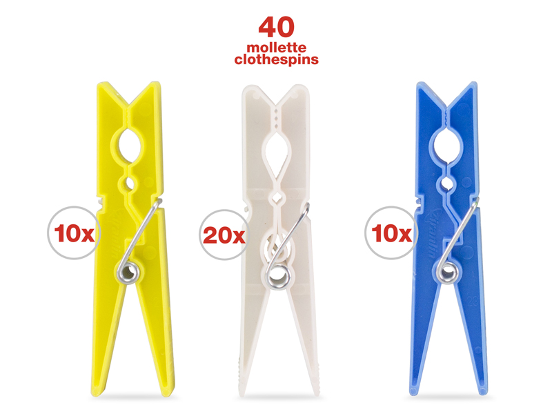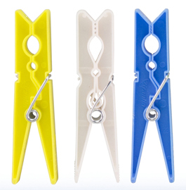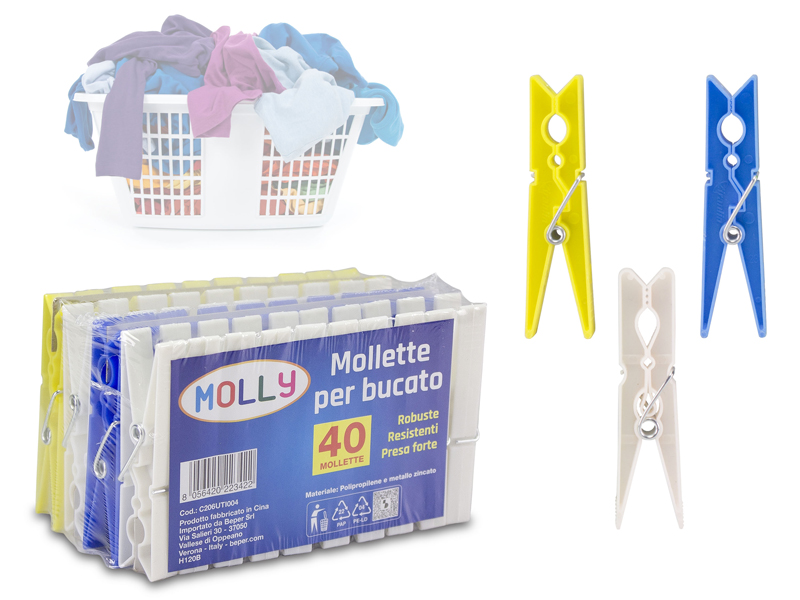 In package: 40 plastic clothes pegs in 3 colors with iron springs; yellow, white and blue