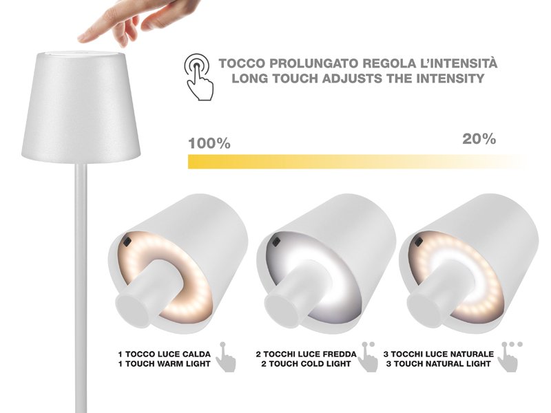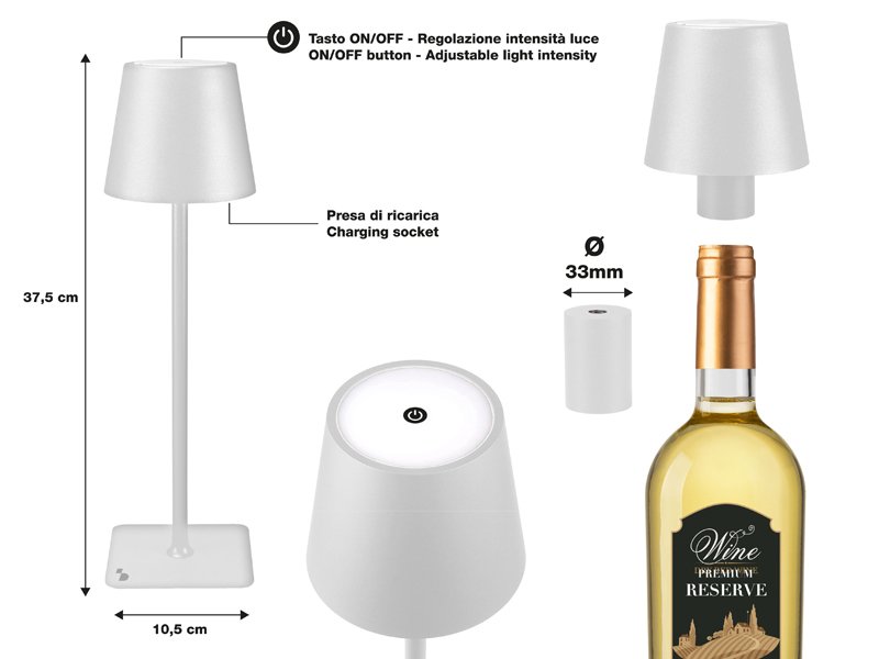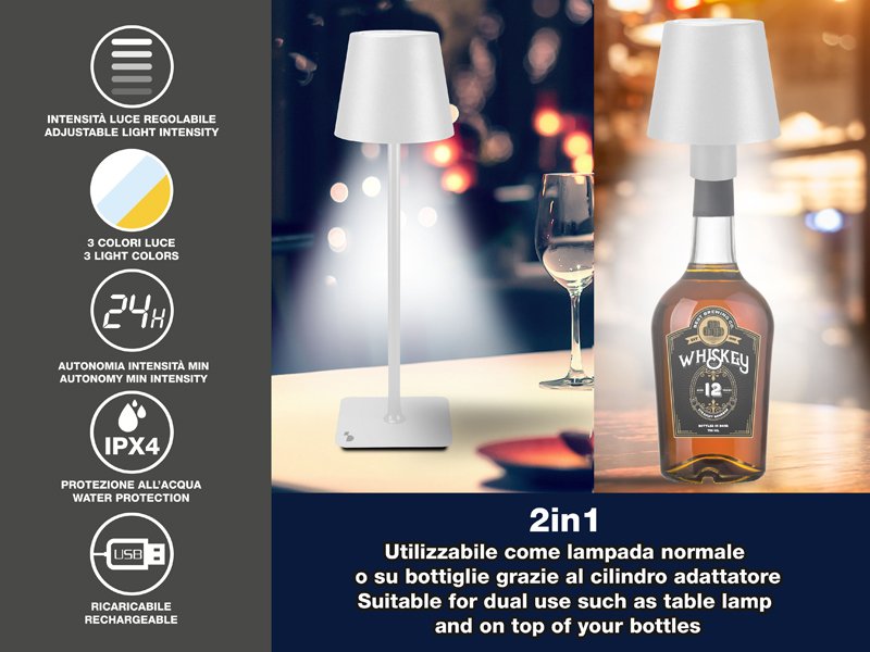 Touch-Controlled Lighting: Activate and switch between warm, cool, or natural light with a simple touch. Adjustable Brightness: Hold down the power button to fine-tune light intensity. Water-Resistant Design: Suitable for both indoor and outdoor use. Versatile Bottle Adapter: Includes a 33mm adaptor to place the lamp on your favorite bottle for a unique tabletop setup. USB Rechargeable: Convenient USB charging cable included.