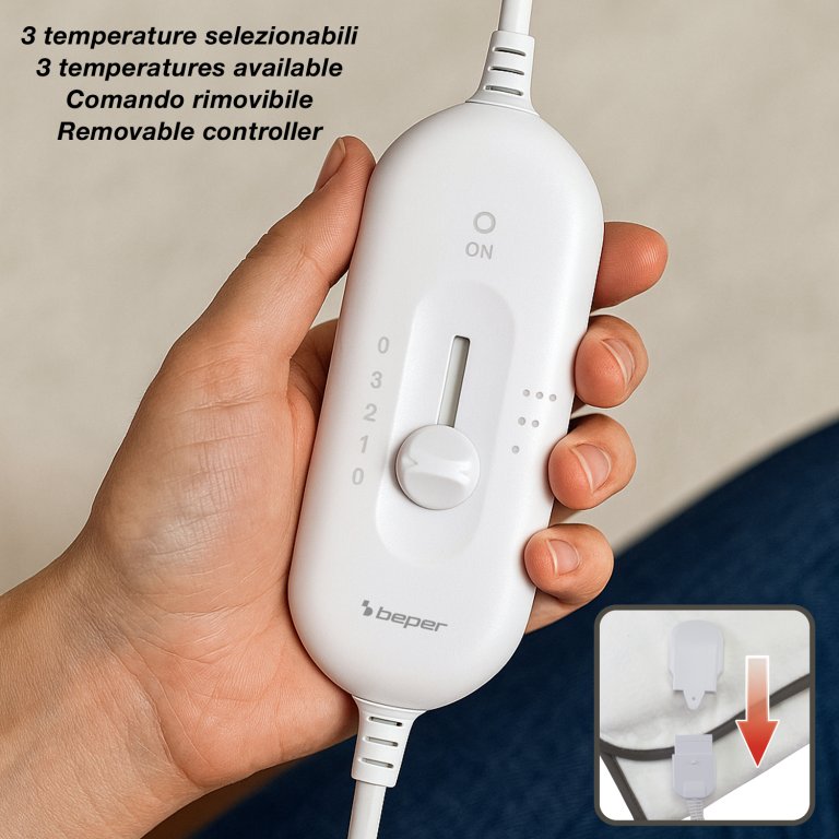 Soft touch polyester electric blanket, with 2 temperature settings available in two different areas thanks to the 2 remote controllers supplied. Easy fixing to the mattress thanks to the slots for the elastic. Machine washable at 30°C thanks to the removable controller. Working light and auto shut off system in case of overheating, for safe use. Size 160x140 cm.