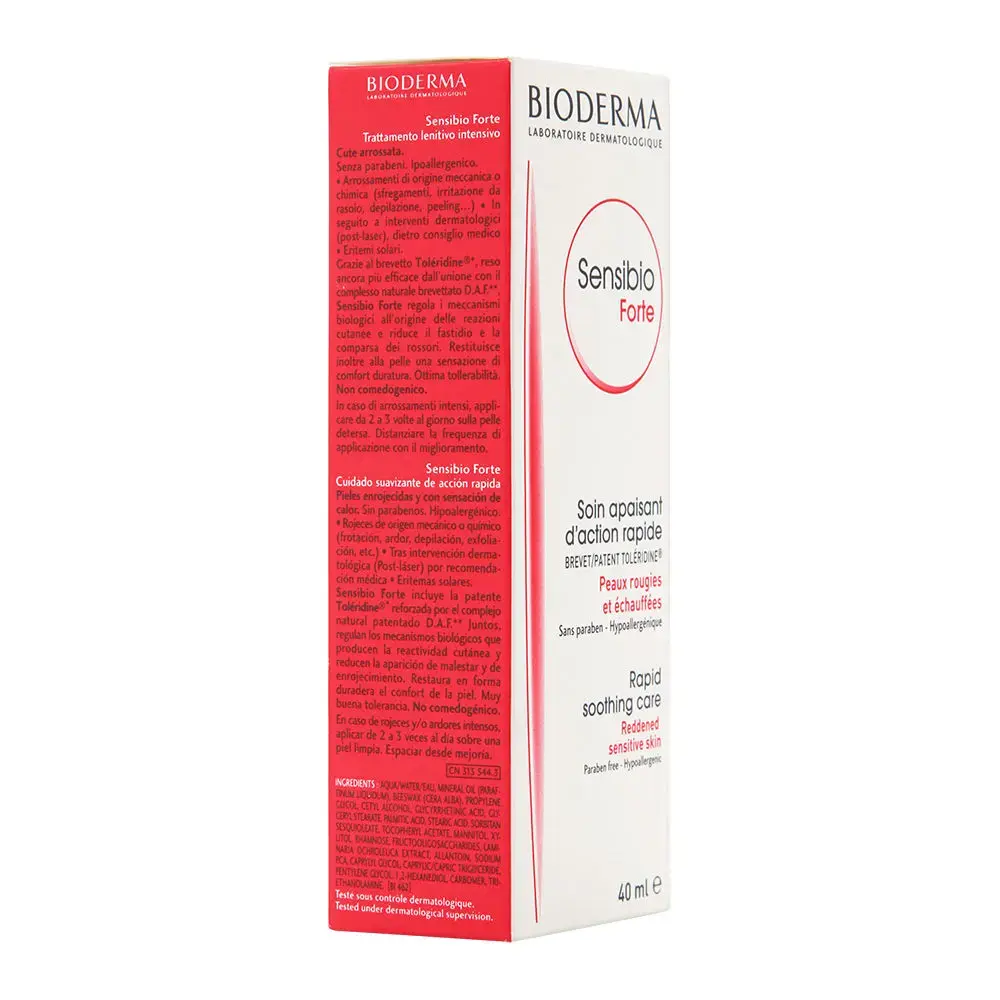 Soothe and relieve sensitive skin with Bioderma Sensibio Forte Cream, a moisturising formula that helps restore comfort back into irritated skin. Suitable for men, women and children, the cream helps to improve skin tolerance while relieving signs related to inflammation, such as rubbing, hair removal and peeling. It combines active ingredients Allantion and Enoxolone with Beeswax and Xylitol to deliver soothing and moisturising benefits. The D.A.F. (Dermatological Advanced Formulation) also helps to combat dehydration that can often accompany irritation. Performing a calming effect on reddened, overheated skin, the cream works with the epidermis to make it less reactive. Suitable for reddened, sensitive skin. Hypoallergenic. Fragrance free.