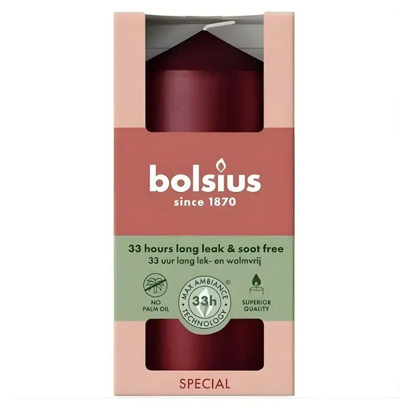 The smooth pillar candle in metallic red is 12 cm tall, will not drip or smudge for up to 33 hours. Made from vegetable wax and palm oil free.