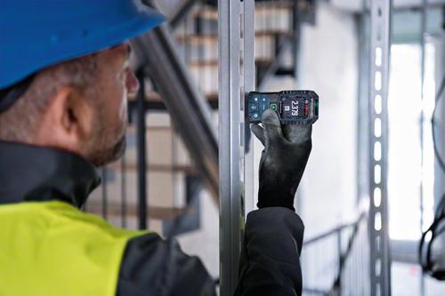 The GLM 50-25 G Professional offers the great visibility of its green laser spot for easier targeting when measuring over long distances indoors. With its IP65 design, it is completely protected from dust particles and against jets of water, while its shock-absorbing housing ensures a 1.5-m drop resistance even on hard concrete. It features a customisable button to define preferred measurement functions or settings and vibration feedback to confirm measurements. Its intuitive user interface supports 30 languages and consists of a colour display and a Big Numbers Mode for better readability.