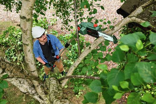 Prune tree branches from ground level effortlessly without using a ladder. The UniversalChainPole 18 enables easy pruning in otherwise unreachable areas with the telescopic pole and pivoting head. The well-balanced, lightweight, ergonomic design minimises strain on arms and shoulders while the tip protector and bumper spike offer maximum control while cutting and undercutting. The automatic chain lubrication and an oil level indicator ensure the tool runs smoothly for consistent results. Use the cordless UniversalChainPole 18 for continuous cutting without damaging trees. The tool belongs to the POWER FOR ALL ALLIANCE. One battery can operate a large variety of tools from different brands.Bosch UniversalChainPole 18. Cutting speed: 4 m/s, Chain speed: 4 m/s, Chain bar length: 20 cm. Power source: Battery, Battery voltage: 18 V, Battery capacity: 2.5 Ah. Bar length: 20 cm, Weight: 3.19 kg, Length (min): 2.1 m. Package width: 195 mm, Package depth: 1170 mm, Package height: 160 mm