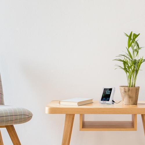 Humidity is also an important factor, as high humidity levels can cause mould to form. You can also set your own visual alarm for this reading so that you will know whether the air in the room is too dry or too moist. If you want to see more than just the current readings, there is also a practical memory function that displays the maximum and minimum values for the last 24 hours as well as the average values from the last 15 minutes and 8 hours for carbon dioxide concentration, temperature and humidity. The device is powered by a power adapter to enable continuous operation.
