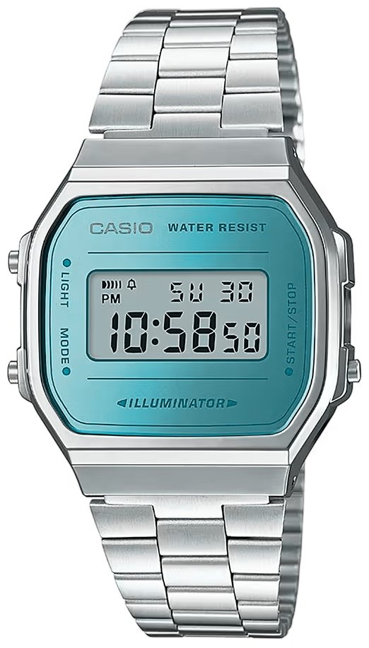 Casio A168WE – This watch doesn't need trends. He has long since set his own. Product description: • Brand: CASIO • Collection: Vintage • Type: men's • Model: A168WE -2EF • Movement: Precise Quartz battery-powered • Dial: Digital dial LCD • Case: Material resin Resin with chrome coating • CRYSTAL: Mineral, scratch-resistant • Bracelet: Stainless steel • Standard functions: hour, minute, seconds, time of day (P ), date, Day of week • Additional functions: Stopwatch 1/100 seconds / Alar / Hourly signal / automatic calendar / 12/24-hour time • And: Electroluminescent (EL) /Blue Green • Water resistance: WR (Water Resistant) • Hypoallergenic: Yes - nickel-free • Battery life: 7-year (7-year battery life) • Case: 35MM × 33MM • Dial: 28 x 26MM • Thickness: 9.6MM • Bracelet width: 20/14 MM • Wrist circumference: 145MM - 205MM • Weight: 50 g Colorway: • Case: silver • Dial: metallic turquoise / mirror finish • Display: gray / Numerals: black • Bracelet: silver • Buckle: silver And Electroluminescent (EL) Blue Green