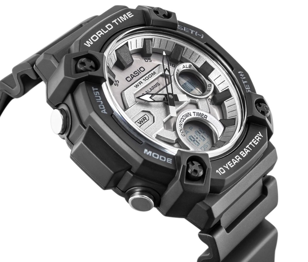 Product description: • Brand: CASIO • Reference: AEQ-120W-7AVDF • Movement: Precise quartz with analog and digital display • Display: Analog + digital • Case: Resin • Bezel: Resin with metallic insert • Crystal: Resin glass • Strap: Resin • Standard functions: time, minutes, seconds, 12/24-hour format, world time, stopwatch, countdown timer, alarms, calendar • Additional functions: 10-year battery life, 30-city world time, 3 alarms, dual time • Water resistance: 10 bar (100 m) — suitable for swimming and surface water sports (not for diving) • Hypoallergenic: Yes — nickel-free and skin-friendly • Case size: 52 × 47 mm • Dial size: 35 × 30 mm • Thickness: 15 mm • Strap width: 22 mm Colorway: • Case: black • Dial: white • Hands: black with Neobrite luminescent coating • Strap: black resin 10-year battery life — reliability and comfort with CASIO.