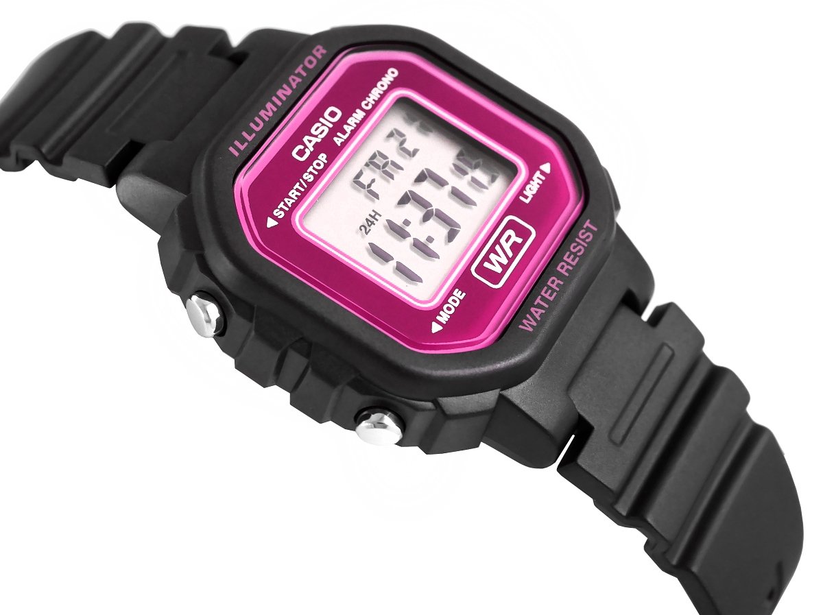 Product description: • Brand: Casio • Reference: LA-20WH-4ADF • Movement: Quartz • Dial: Digital LCD Display • Case: Material resin Resin • Crystal: resin crystal Resin Glass • Strap: Material resin Resin • And: LED and Amber color • Water resistance: WR (Waater Resistant) • Hypoallergenic: Yes - nickel-free • Case: 29×32MM • Dial: 19×21MM • Thickness: 8.6MM • Strap: 16MM • Wrist circumference: 120-185MM Colorway: • Case: black • Dial: purple/black • Logo on the dial: white • Strap: black