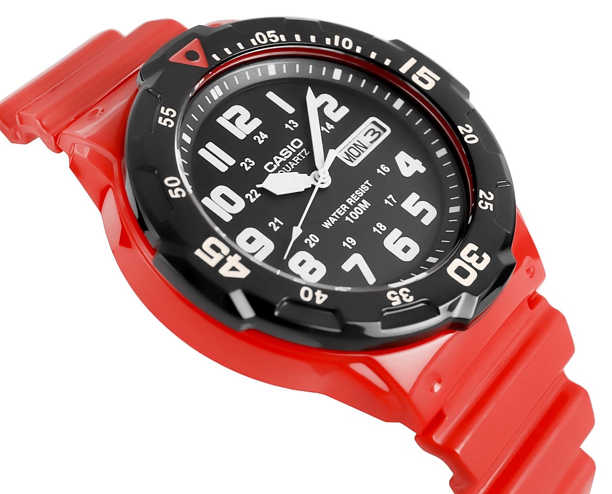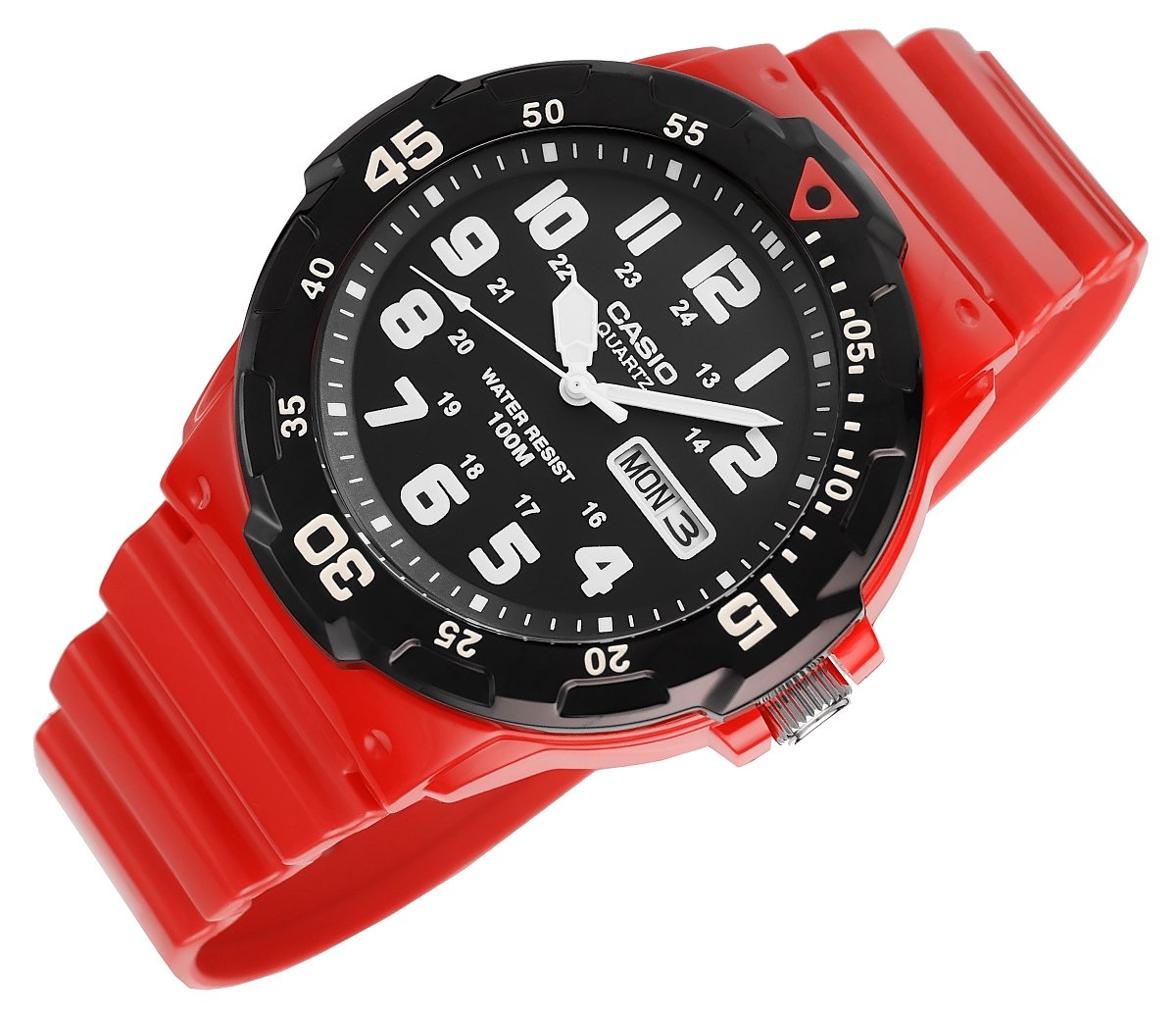 Product description: • Brand: Casio • Model: MRW-200HC-4BVDF • Movement: Precise Quartz with three hands: hour, minute and seconds • Dial: Analog with date display of days of the week and of the month • Case: Material resin Resin • Crystal: resin crystal Resin Glass • Strap: Material resin Resin • And: coating Neobrite luminescence luminescence tips • WATER RESISTANCE: 10 bar • Hypoallergenic: Yes - nickel-free • Case: 43MM • Dial: 31MM • Thickness: 11.5MM • Strap: 23/17 MM • Wrist circumference: 165-235MM Colorway: • Case: ed • Dial: black • hour markers: white • Hands: white with coating Nerobite • Second hand: white • Strap: ed • Buckle: black Water resistance 10 BAR - RELIABILITY and EXTREME CONDITIONS the watch easily copes with accidental showers, rain and even contact with water during activities such as swimming or recreational water sports. Solid construction with durability for the urban jungle and outdoor adventures. RESIN strap (Material resin)