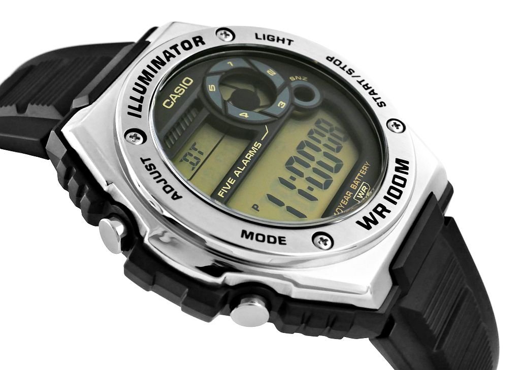 Product description: • Brand: Casio • Movement: Quartz • And: LED • Case: High-quality durable material • Crystal: acrylic with enhanced resistance to scratches and accidental impacts. • Strap: polycarbonate, waterproof • WATER RESISTANCE: 10 bar • Hypoallergenic: Yes — nickel-free — excellent for allergy sufferers • authenticity: on caseback watch has engraved and from manufacturer, confirming authenticity. • Case: 44×50 • Dial: 32 • Thickness: 14.2 • Strap width: 20 • Wrist circumference: 160-235 Colorway: • Case: silver-black • Dial: black and yellow • Strap: black