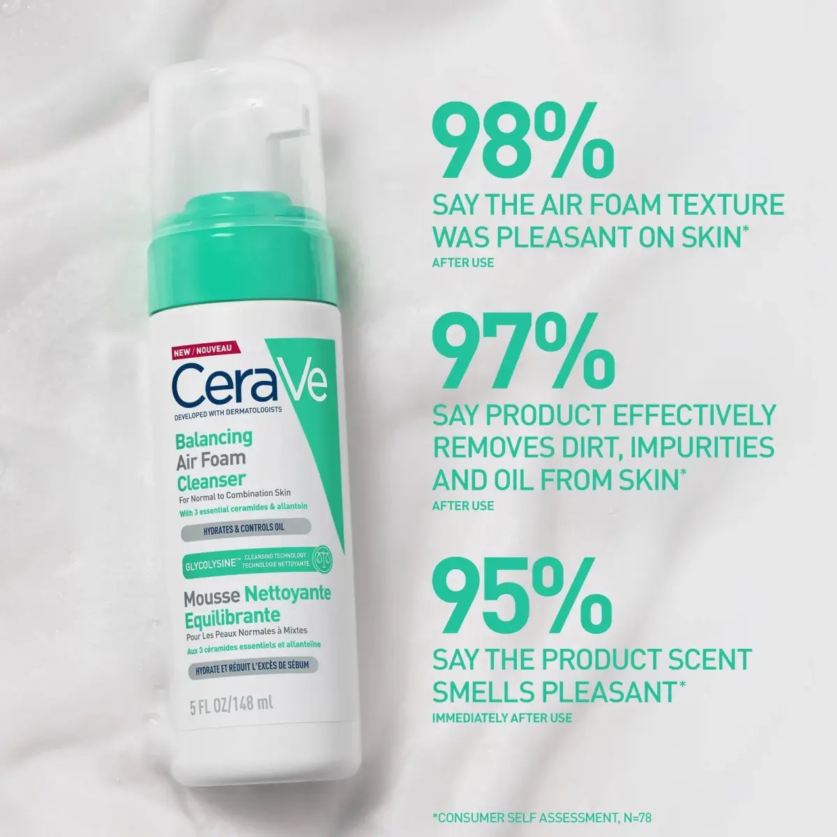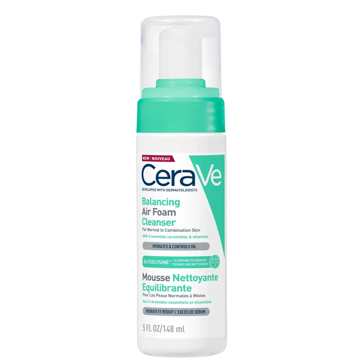 CeraVe's new Balancing Air Foam Foaming Facial Cleanser is a new cleanser featuring Ceramides, Glycolysine™ and Allantoin to clean the skin without stripping it. Developed with normal to combination skin types in mind, this cleanser incorporates CeraVe's Glycolysine™. Glycolysine™ is a patented bio-based surfactant that cleanses and controls excess oil for up to 8 hours*, whilst hydrating the skin for up to 24 hours**. Other barrier boosting ingredients like Ceramides and Allantoin deliver even more hydration to support the skin barrier. This cleanser is gentle enough for skin on the sensitive side as it is free of added fragrance, hypoallergenic, and non-comedogenic. Get squeaky clean, hydrated skin by using this cleanser as the first step in your skin care routine. *Instrumental test, 30 subjects**Instrumental test, 27 subjects Benefits of CeraVe Balancing Air Foam Foaming Facial Cleanser: Supports the skin barrier with a non-comedogenic auto foam for a gentle cleanse. Removes dirt and impurities*. Controls oil for up to 8 hours** and moisturises for up to 24 hours***. *97% agreement.**Instrumental test, 30 subjects.***Instrumental test, 27 subjects. How to use: Massage cleanser into wet skin. Rinse. Avoid eye area. In case of contact with eyes, rinse immediately. Keep upright when pumping. Size: 150ml.
