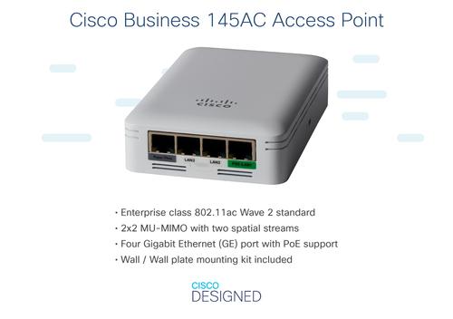Cisco Business 145AC juurdepääsupunkt pakub ühendatud juurdepääsu, mis sobib ideaalselt väikestele hotellidele, jaemüügi-, büroo- ja hariduskeskkondadele. Suure jõudlusega MU-MIMO (2x2) juurdepääsupunktid tagavad ettevõtlaklassi traaditaühenduse väikestele ettevõtetele. Integreeritud Power over Ethernet (PoE) port pakub täiendavat ühendusvõimalust.