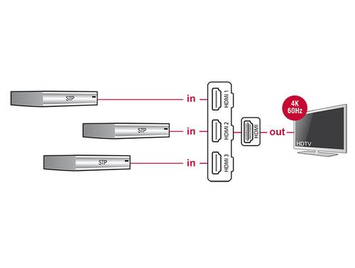With this HDMI switch by Delock up to three HDMI devices can be used with one HDMI monitor, TV or beamer. The button on the device allows switching between the HDMI devices.DeLOCK 18600. Video port type: HDMI. Material: Plastic, Product colour: Black, Bandwidth: 18 Gbit/s. Width: 81 mm, Depth: 62 mm, Height: 16 mm