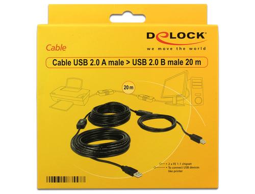 The USB 2.0 cable by Delock enables you to connect active USB devices with USB type B interface, e.g. printer, external HDD enclosure etc. to a free USB type A port. The double shielded cable and the higher cable gauge of power line ensure a safe connection between your device and computer.DeLOCK 20m, USB2.0-A - USB2.0-B. Cable length: 20 m. Connector 1: USB A, Connector 2: USB B, USB version: USB 2.0, Connector gender: Male/Male, Maximum data transfer rate: 0.48 Gbit/s, Product colour: Black