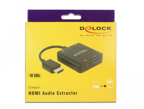 This adapter by Delock can be used to extract the audio signal from an HDMI transmission. While the video signal is displayed on a TV or monitor, the audio signal can be sent digital (S/PDIF) or analogue (stereo) to other devices, such as headphones or a surround receiver.DeLOCK 63276. Connector 1: HDMI Type A (Standard), Connector 2: HDMI Type A (Standard), Connector 1 gender: Male