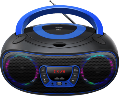The Denver TCL-212BT boombox brings colour and music to any room. With a CD player, FM radio, USB port and AUX input, it offers a wide range of playback options - even via Bluetooth from a smartphone. The speakers with LED lighting provide visual highlights, while the telescopic aerial ensures good radio reception. Whether mains-powered or mobile with batteries: This boombox is ready for use anywhere.Features CD player, FM radio and USB for MP3 playbackBluetooth function for wireless music streamingAUX and headphone connection for flexible useLED lighting in the speaker grille for cool effectsOperation via mains adapter or 4× C-batteries possibleTechnical data Connections Bluetooth Display EAN 5706751040702 Weight 1610 gManufacturer Denver Jack connection 3,5 mm Headphone connection Scope of delivery Boombox, 230 V mains adapter, operating instructions Dimensions (W x H x D) 211 x 132 x 226 mmProduct type music systems compact Product colour blue Radio Other CD player