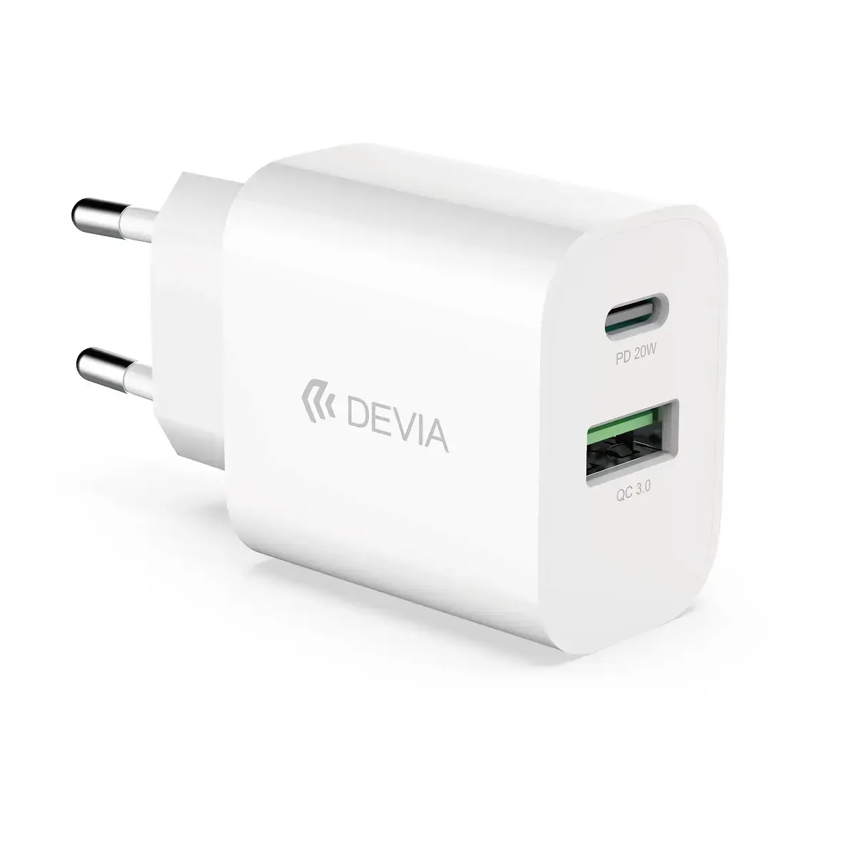 Devia Smart is an advanced wall charger equipped with two ports: one is USB QC and the other is USB-C PD. It provides enough power for fast charging even the largest available mobile devices. The classic design fits all types of interiors, and the quality of workmanship indicates that it is a solid and durable device.
