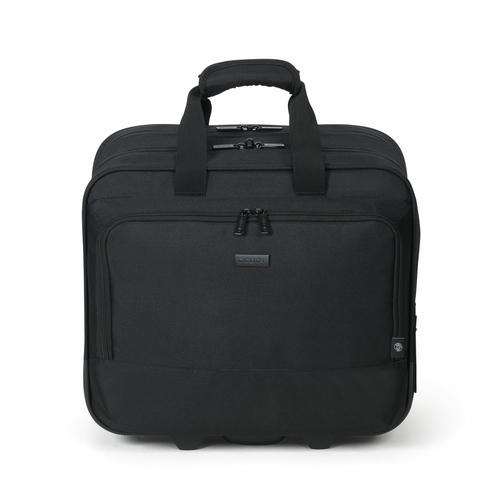 The Eco Top Traveller BASE is the intelligent trolley for environmentally-conscious professionals. Designed for daily use and equipped with practical functions that make your life easier. Your 13-16" notebook is highly protected in the padded main compartment. Even your tablet up to 12.9" can be safely stored in the padded slip pocket. The generous main compartment offers storage space for clothing and documents. The spacious front compartment with a practical and easy-access workstation for your mobile accessories allows you to organise your personal items with holders for items such as pens, business cards, IDs and smartphone. The address label compartment makes every journey effortless and stress free. The reinforced bottom part, quality-wheels, a telescopic handle made of high-class materials as well as the durable, water repellent main material assure long-lasting transportation comfort. The Roller Eco Top Traveller BASE is perfect for you if you are always on the go and want to support the recycling of PET bottles with an eco-friendly trolley.DICOTA Laptop Roller Top Traveller Eco BASE 13 -16