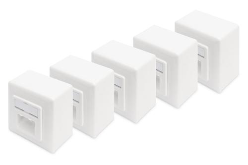 The shielded CAT 6 network outlets from DIGITUS® are certificated to CAT 6 EIA/TIA 568 and ISO/IEC 11801, EN 50173. The cable installation takesplace via LSA strips, color coded acc. EIA/TIA 568 B with horizontal cable entry. All network outlets from DIGITUS® are available flush mount or surface mount.Digitus CAT 6, Class E, modular wall outlet, shielded. Socket type: RJ-45. Product colour: White. Country of origin: China