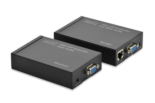 Extends a VGA signal up to 300 m, using only a simple UTP cable between the transmitter and receiver units.Digitus VGA UTP extender set. Type: AV transmitter & receiver, Maximum resolution: 1920 x 1200 pixels, Cable types supported: Cat5. Audio input: 3.5mm, Audio output: 3.5mm. Dimensions (WxDxH): 75 x 110 x 25 mm, Receiver weight: 208 g, Transmitter weight: 213 g. Package width: 175 mm, Package depth: 273 mm, Package weight: 760 g