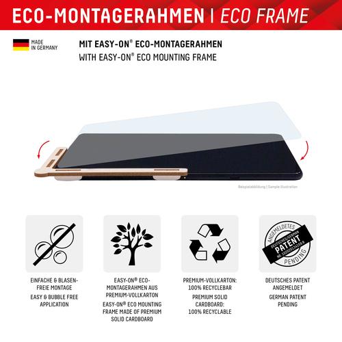 The EASY-ON® Eco Mounting Frame makes mounting the Tablet Glass quick, easy and precise. The result: no crooked positioning of the screen protector on the display, no concealed openings for speakers or microphones and certainly no bubbles under the protective glass. Good for the environment: the EASY-ON® Eco Mounting Frame is made of recyclable premium solid cardboard and can be recycled with waste paper without hesitation after use.