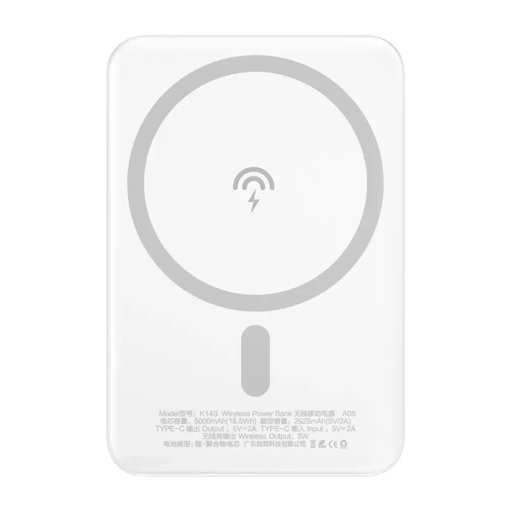 Introducing the Dudao K14S Powerbank, a sleek and efficient external battery designed to keep your devices charged on the go. With a capacity of 5000mAh, this power bank is perfect for charging your iPhone and other compatible devices wirelessly using MagSafe technology. Experience the convenience of wireless charging with a maximum output of 5W, ensuring your phone stays powered up without the hassle of cables. The Dudao K14S also features standard safety sensors, including anti-overvoltage and anti-overload protection, making it a reliable choice for your charging needs. Whether you're at home or on the move, the Dudao K14S is your perfect charging companion.