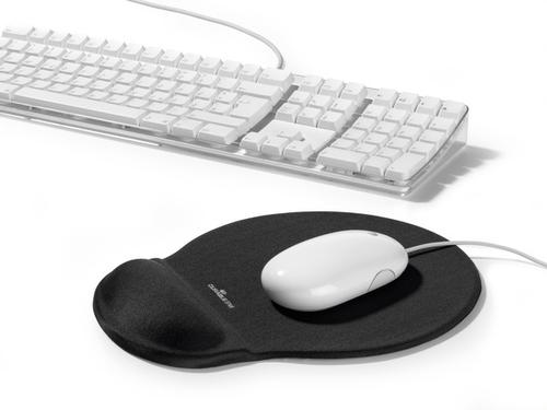 Ergonomically shaped mouse pad with integrated gel-filled wrist support.