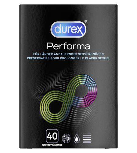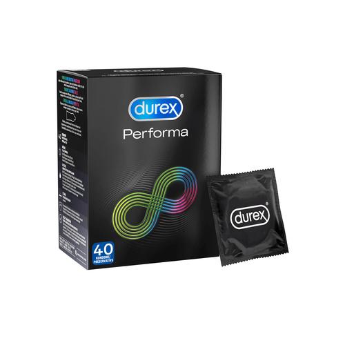 Durex Performa 40. Tüüp: Meeste kondoom, Pinnatekstuur: Hõlpsa, Toote värv: Läbipaistev. Laius: 56 mm. Pakis kogus: 40 tk
