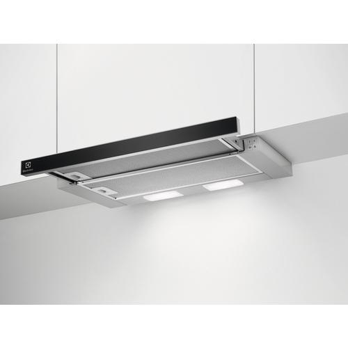 Electrolux Serie 300 LFP326AB. Maximum extraction power: 410 m³/h, Fluid dynamic efficiency class: D, Lighting efficiency class: E. Type: Semi built-in (pull out), Product colour: Grey, Control type: Buttons. Number of bulbs: 2 bulb(s), Bulb type: LED, Lighting efficiency (LE): 10 lux/W. Energy efficiency class: C, Annual energy consumption: 57 kWh, Energy efficiency scale: A+++ to D. Width: 598 mm, Depth: 284 mm, Height (min): 17.9 cm