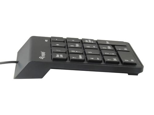 This keypad is ideal for inputting numeric data into spreadsheets on a laptop or PC. The keypad features a simple Plug-and-play setup to get everything done quickly and easily, with soft touch keys for comfortable typing. The keypad allows you to enter digits fast and accurately, whether you need to multiply, divide, subtract or add figures. A great way to speed up your spreadsheet applications.Equip USB Numeric keypad. Device interface: USB, Keyboard number of keys: 18, Purpose: Universal. Cable length: 1.35 m, Product colour: Black. Weight: 85 g