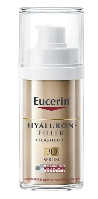 EucerinHyaluron-Filler + Elasticity 3D Serum, inspired by dermatological treatments, is a lightweight and hydrating anti-aging serum that effectively treats the 3 dimensions of skin aging:| Age Spots: Thiamidol® formula targets the root cause of hyperpigmentation and has been clinically proven to effectively relieve age spots with regular use and prevent their reappearance.| Loss of elasticity: The active ingredient arctiine has been shown to stimulate collagen production in the skin. Combined with the hyaluronic acid in our formula, it helps improve skin elasticity.| Wrinkles: As our skin ages, deeper wrinkles appear. Our innovative composition of long and short chain hyaluronic acid visibly smoothes deep wrinkles. While long-chain hyaluronic acid helps smooth the outer layers of the skin, short-chain hyaluronic acid, 40 times smaller in comparison, penetrates further into the epidermal layers of the skin, dovedeeper wrinkles appear. EucerinHyaluron-Filler + Elasticity 3D Serum effectively reduces age spots, visibly fills deep wrinkles and improves elasticity. The skin is more uniform and compact.|.