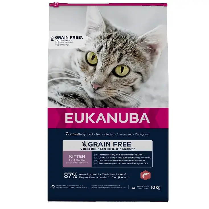EUKANUBA grain-free: dry cat food (For kittens)High in salmon Ingredients: Dried chicken and turkey: 39% (chicken 23%), fresh frozen salmon (20%), potatoes, whole peas, poultry fat, driedBeet pulp (1,7%), chicken sauce, fructooligosaccharides (0,65%), dried brewer's yeast. Analytical constituents Nutrients protein 40% fat 20% omega-6 fatty acids 3.66% omega-3 fatty acids 1.17% DHA 0.21% crude ash 7.5% crude fibrecalcium 1.5% phosphorus 1.3% magnesium 0.08% taurine 0.22%Energy blendMetabolisable energy (NRC, 2006a) 4201 kcal/kg Vitamin A50 000 IU vitamin D3 1438 IU vitamin E 124 mg Micronutrients copper (copper (II) sulphate pentahydrate) 7,7 mg iodine (potassium iodide) 1 mg manganesens (manganese sulfate monohydrate) 35 mg zinc (zinc oxide) 88 mg Antioxidants help strengthen natural defences and promote vitality. Omega-3 fatty acids from natural sources Prebiotics and crossnutrients strengthen gut health and promote digestion More taurine to support heart health High levels of animal protein (87% of total protein) help build and maintain healthhealthy body massPotatoes and peas are a natural source of fiber and minerals