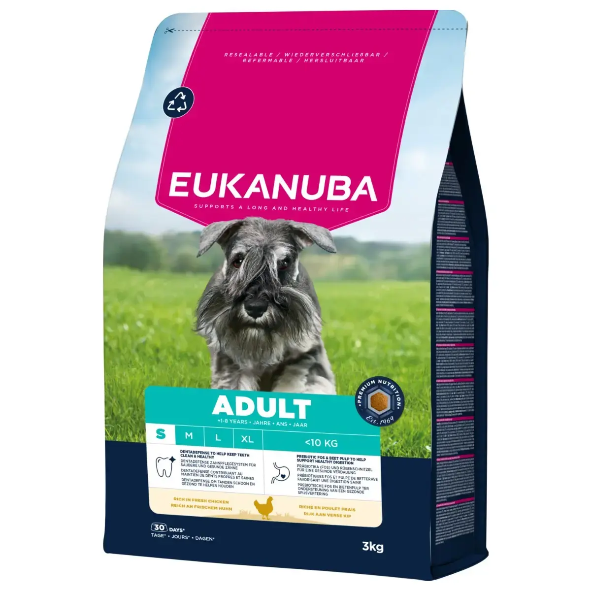 EUKANUBA sausā barība ir bagāta ar svaigu vistu un satur rūpīgi atlasītas sastāvdaļas, lai nodrošinātu pielāgotu uzturu un optimālu jūsu suņa labsajūtu.