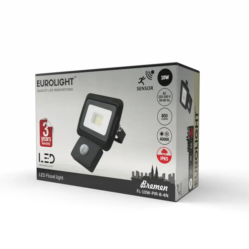 EUROLIGHT BREMEN LED prožektor liikumisanduriga 10W, 4000K, IP65, 80lm/W (FL-10W-PIR-B-4N)