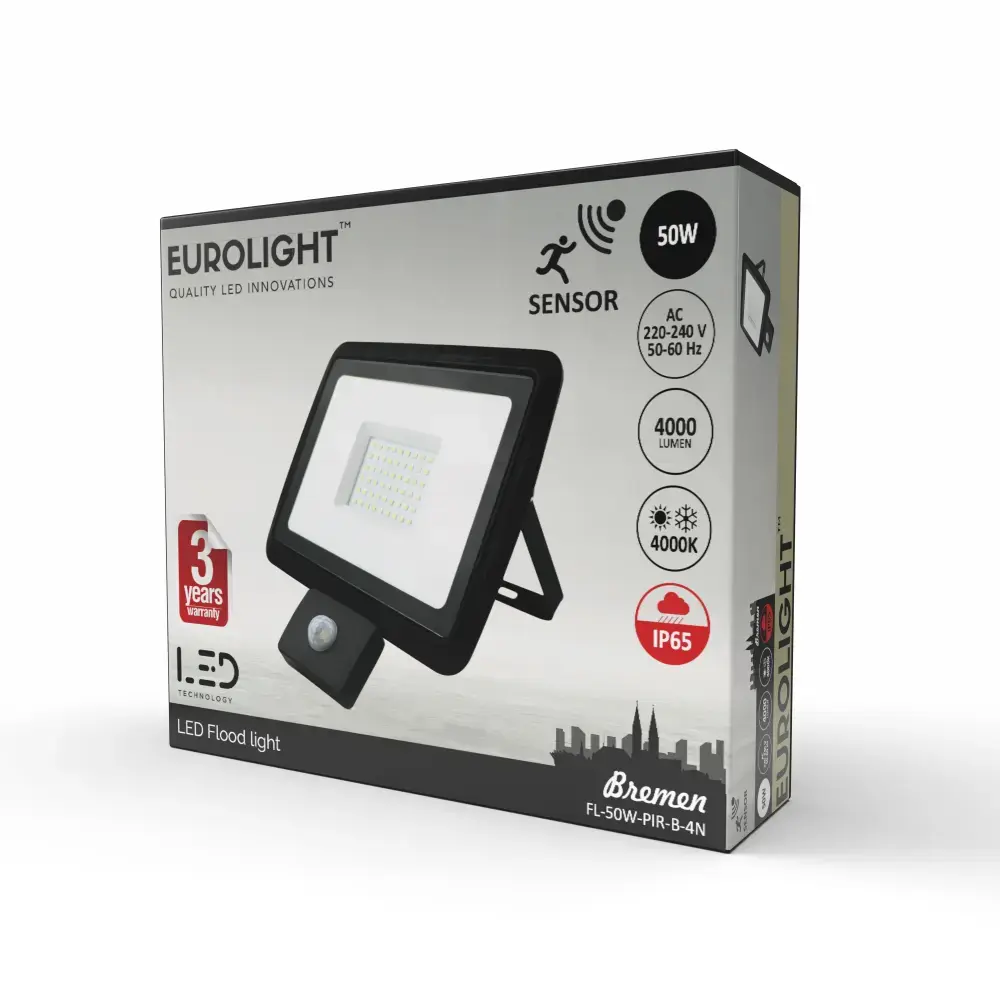 EUROLIGHT BREMEN LED prožektori liikumisanduriga 50W, 4000K, IP65, 80lm/W (FL-50W-PIR-B-4N)